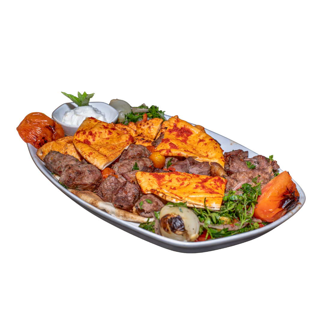 Kuzu pirzola, Tavuk pirzola, Sucuk, Köfte, Kuzu şiş, Pilav, Patates, Biber, Domates, Lavaş İle Servis Edilir